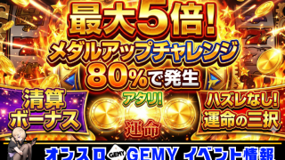 GEMY(イベント情報) 最大5倍!メダルアップチャレンジ開催中 80%で発生の清算ボーナスに注目