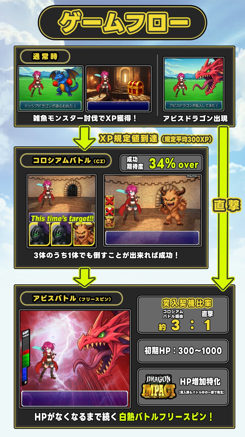 ○通常時はザコドラゴン3種を倒してXPを貯める→コロシアムバトル(チャンスゾーン)でボスのいずれかを撃破→アビスバトル(フリースピン)