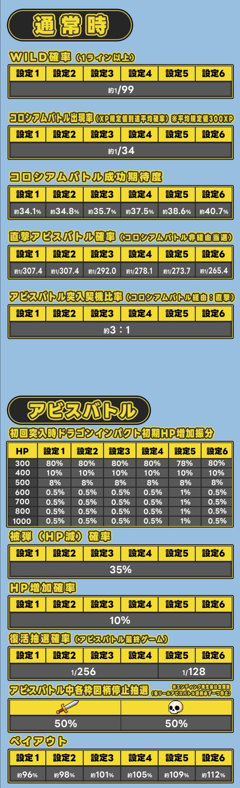 『ドラゴンRPG』は5リールだけど、コロシアムバトル成功期待度や直撃アビスバトル確率、アビスバトルで選択されるリーナのHPに設定差があるので、該当する項目のデータを取りながら打っていくと、設定が見えてくると思います。