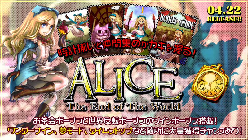 \本日、12時新作リリース/不思議な仲間たちと共にアリスがパワーアップして帰ってきた!!#NEWゲーム『ALICE The End of The World』☕お茶会&世界反転のツインボーナス🐰時計そろいと仲間集めがカギを握る!#MGDX ...