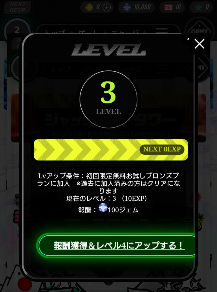 レベル3に昇格する時の条件で、初回限定お試しブロンズプランに加入する時が来ます。このお試しブロンズプランの期間中に1日2回のデイリーチャンスを必ず引いてチケットをゲットして、アカウントのレベルアップを進めましょう。