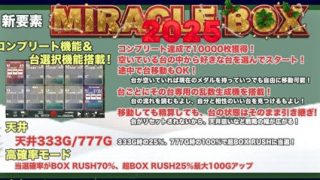 ミリオンキングダム MIRACLE BOX 2025 攻略情報 ◆攻略ポイント◆新台 MIRACLE BOX 2025 には、9サイトで構成されている当オンスロ業界では初の「台選択機能」という新システムが搭載されました。MIRACLE BOX 2025 を起動すると下のシマのような画面になり、10台の状... 2026.01.22 ミリオンキングダム機種紹介解析攻略ノウハウ