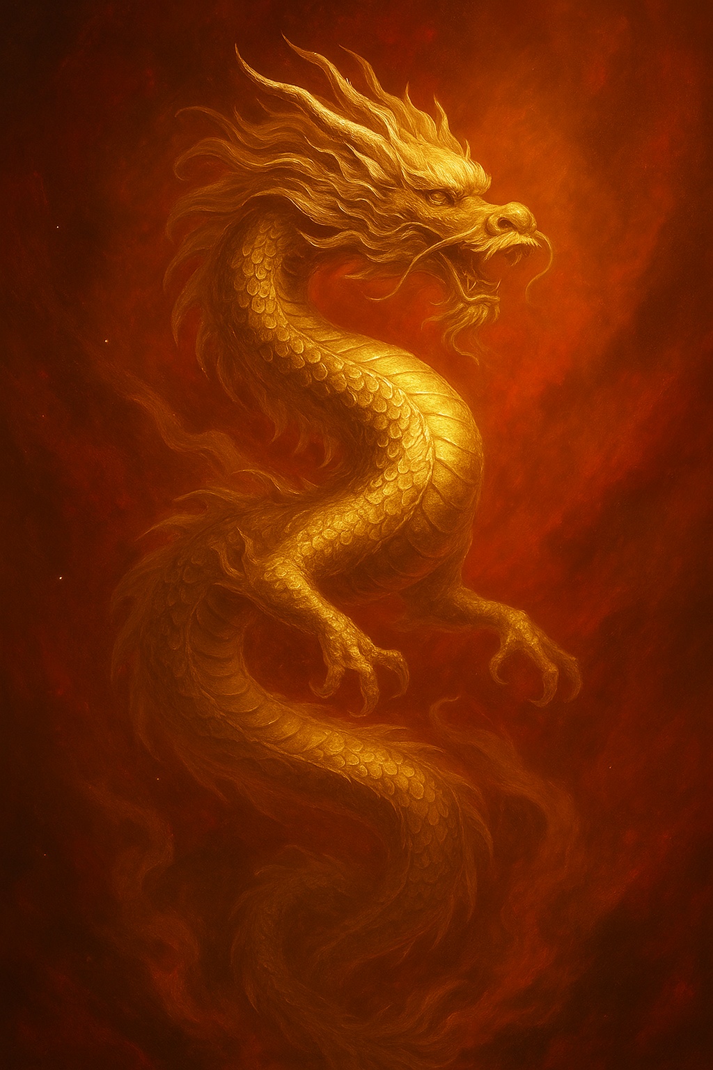 黄金の龍が天空へと昇る瞬間を描いた壁紙デザイン画像。