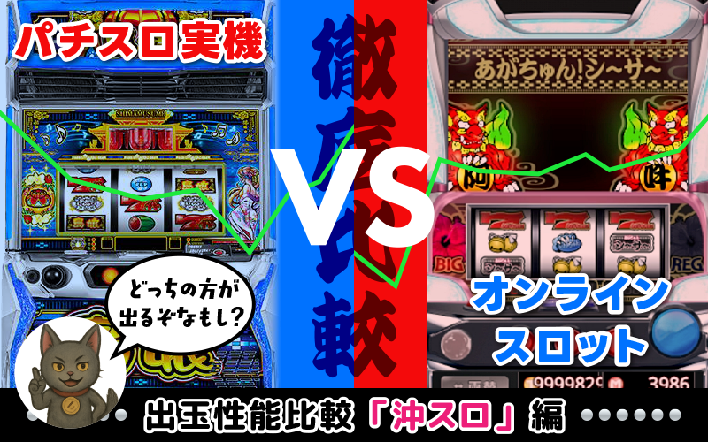 実機 パチスロとオンラインスロットの出玉性能比較に肉薄!今回は現役設置中の沖スロ対決!オンラインスロットゲームで遊びたい、勝ちたい、攻略したい人は必見。パチスロとオンスロの違いを理解してもっと楽しもう!オンスロ、演出信頼度、攻略情報、オンス...