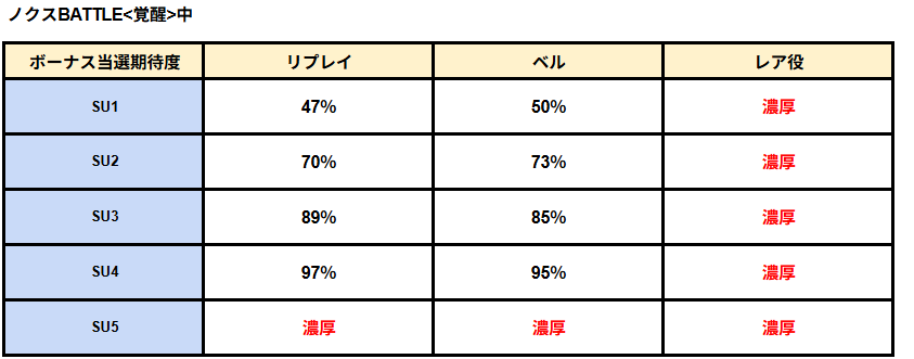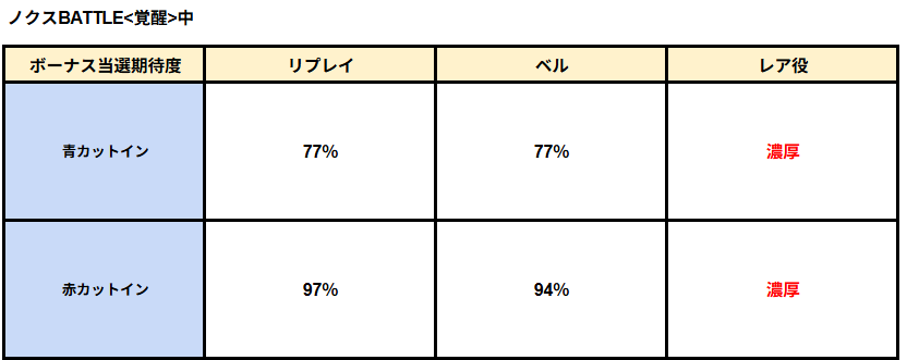 新たな解析数値としてノクスボーナス中の覚醒昇格抽選の数値が判明!
