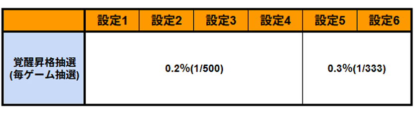 毎ゲーム上記数値で抽選が行われる。0.2%という数字で見るととても薄いように見えるかもしれないが、ST5回に1回(平均値)ほどで突入に期待が出来る数値(設定1~4)となっているため、引き次第ではST当選時続け様に覚醒突入へ行けるような展開もなくはないだろう。覚醒突入が頻繁にするようなら設定5or6の期待が高まるぞ!