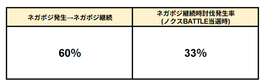 スタート押下時にネガポジが発生した際にリール停止時までネガポジが継続する期待度と、ネガポジが継続時の討伐発生率(ノクスBATTLE当選時)。ネガポジが継続まで到達しているのに討伐が何度もできないとノクスBATTLE非当選の可能性が頭をよぎってしまう。