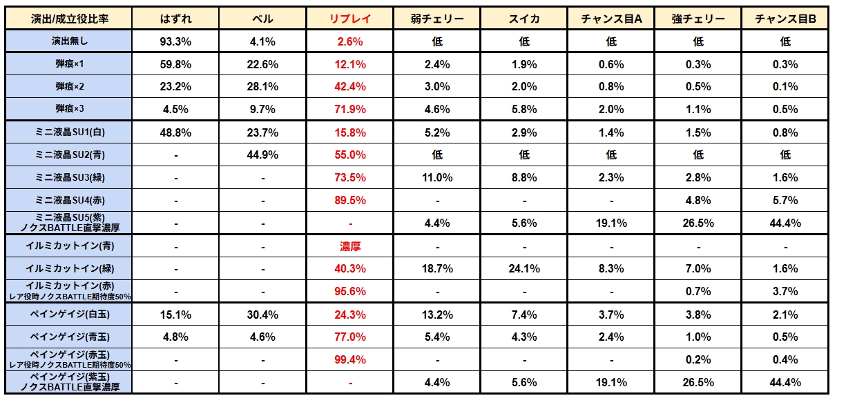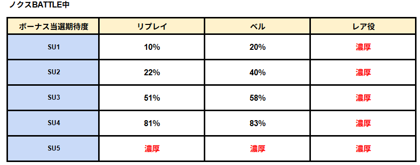 リプレイ2連成立でCZSTに入るゲーム性のため、とにかく各演出のリプレイ期待度を頭に入れて遊戯すると更に熱く楽しく打てる。大事なリプレイ2連時は演出さえ発生すれば一気に期待度が上昇する。また、【イルミ(赤)/ペインゲイジ(赤玉)】はレア役時はノクスBATTLE期待度50%、【ミニ液晶SU5(紫)/ペインゲイジ(紫玉)】はノクスBATTLE直撃濃厚という法則は覚えておいて損なし!