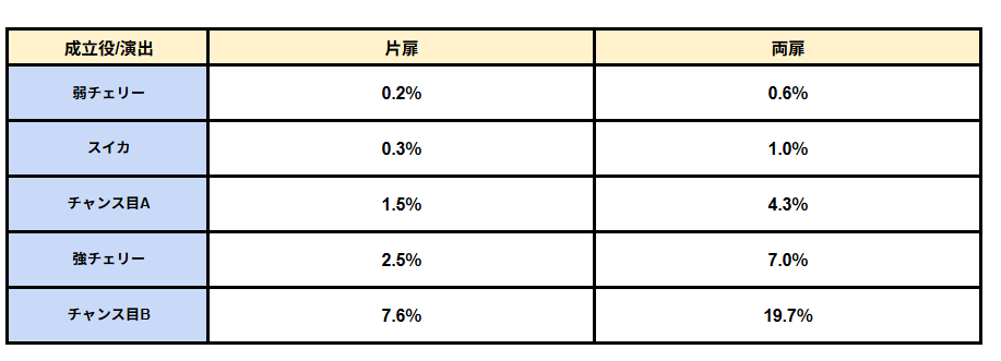 レア役成立時は【ノクスBATTLE直撃】に期待!とは言え、ノクスBATTLE突入へのメインルートはブラントボーナス中のブラント撃破からとなるため、あくまでも薄い確率での当選として搭載されている存在だ。片扉より両扉は3倍チャンス、強レア役(強チェリー/チャンス目B)なら期待度は格段に上がると覚えておこう!