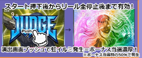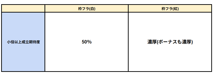 枠フラ(白)発生で小役以上(リプレイ/ベル/レア役いずれか)成立期待度は50%!枠フラ(虹)発生はボーナス濃厚のプレミア演出(ボーナス当選時の1%で出現)となる。