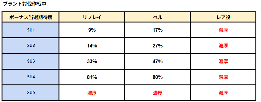 まずは望みたいのはSU3緑まで進むこと。とはいえ、そもそもの小役成立時のボーナス当選期待の高さゆえSU1やSU2でも全くボーナスに期待できないわけではないので、どんな状態でも次ゲームのブラックアウトへの期待は出来るバランスとなっているぞ!