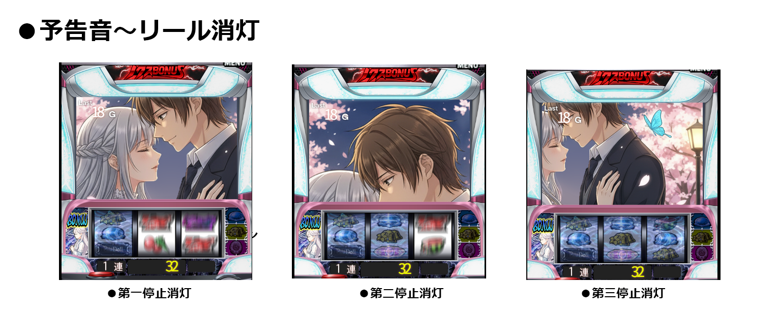 ST中の小役成立でボーナスに期待できるゲーム性のため、1リール毎の停止にも熱くなれる!最終Gは小役成立で問答無用のボーナス濃厚!小役1確目が見れる左リール停止箇所変更や、右リールからの変則押しなども楽しめる!