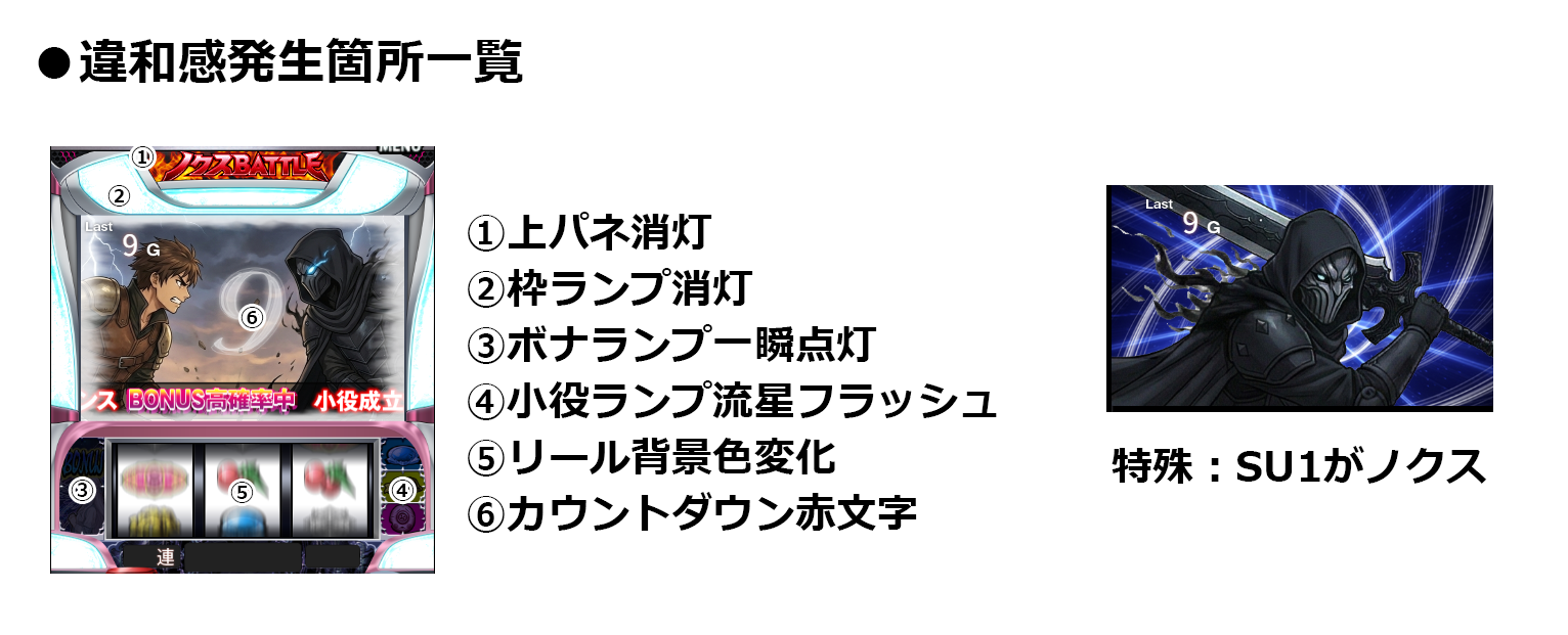 違和感は発生=BONUS当選濃厚となる嬉しい瞬間!各種タイミング(スタート押下時/第一停止時/第二停止時/第三停止時)&様々な場所で出現するため色んな場所に目を向けてプレイすることで更に楽しめる!