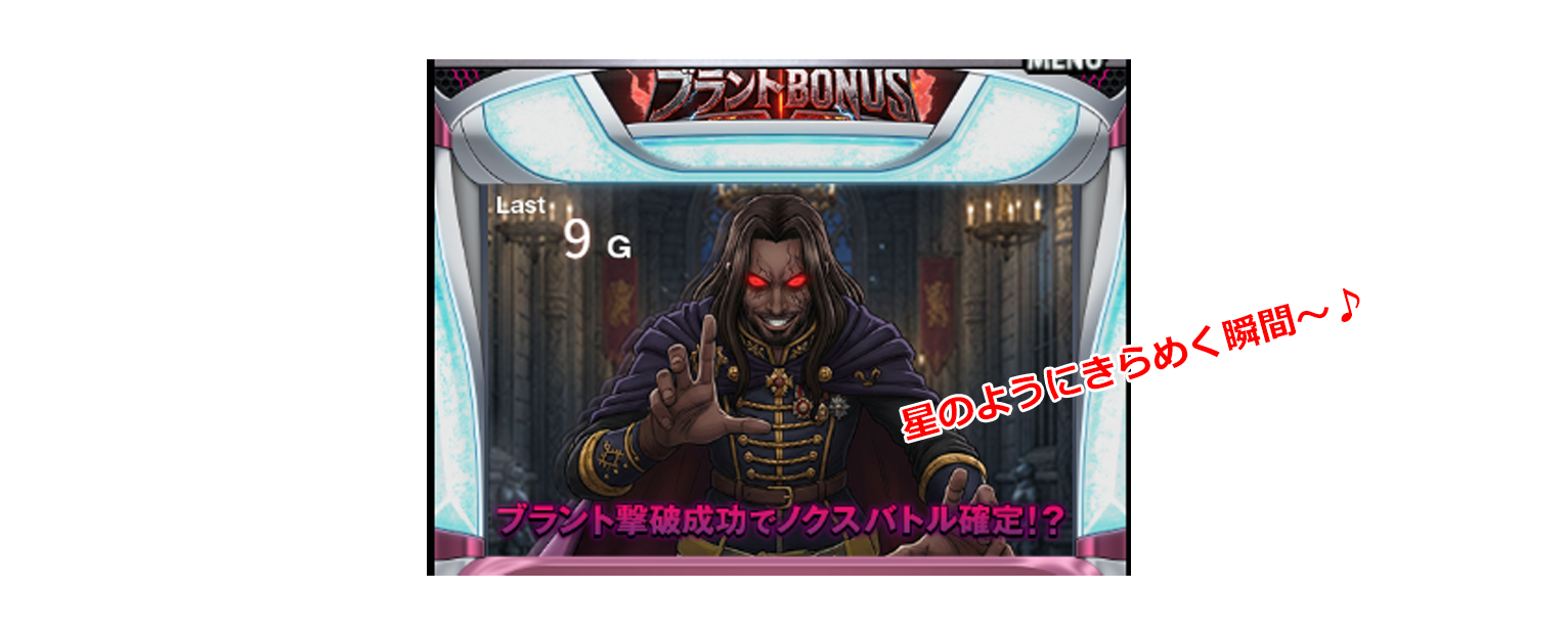 ブラントボーナス突入時にノクスBATTLE突入抽選を行い、ブラントボーナス消化中は当否の告知を行っている。