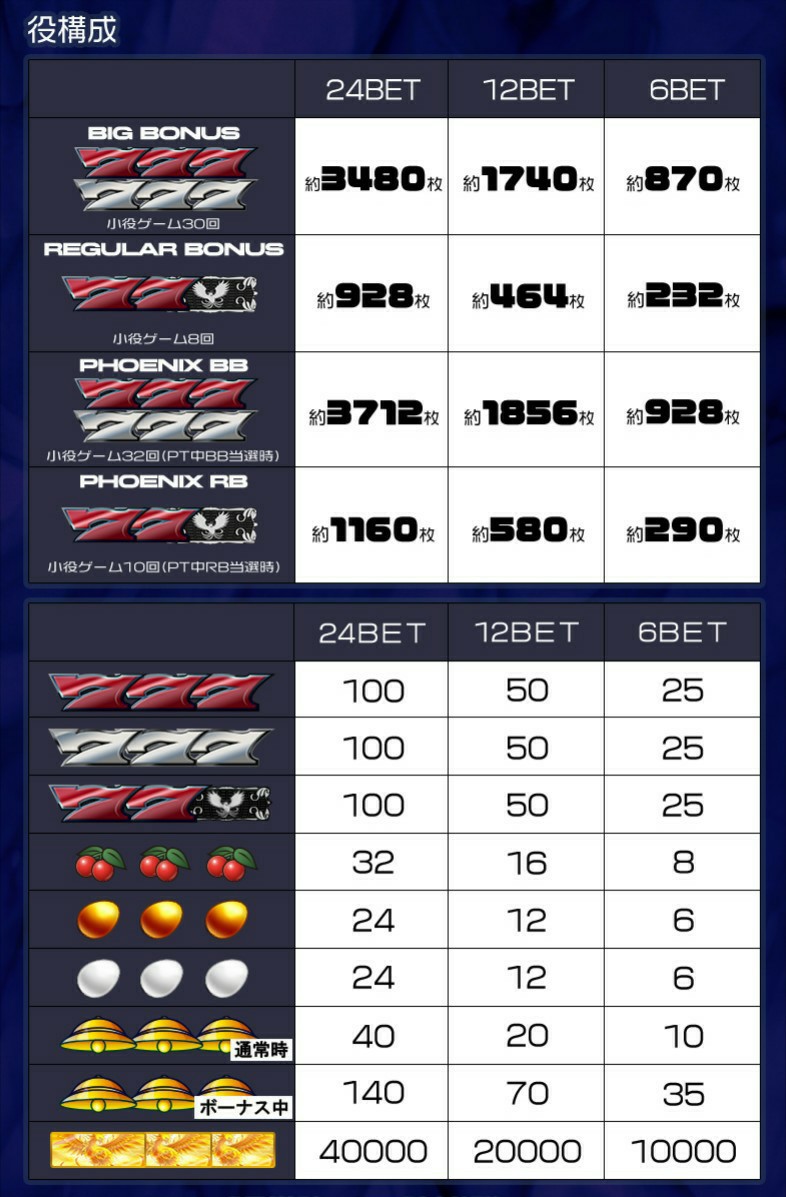 | 基本情報詳細 | BIGボーナス、REGボーナス、PHOENIX BIGボーナス、PHOENIX REGボーナスを搭載した実機風スロット。 ボーナス初当たり→ボーナス後のPHOENIX TIME突入(リプレイタイム)→ボーナス再当選→再度PHOENIX TIME突入!のループで大量獲得を目指せ!ボーナス消化中に白タマゴ成立でプレミア役当選の大チャンスが到来だ!通常時の白タマゴ連続成立、チェリー成立、金のタマゴ成立はボーナス当選に期待しよう。 実践中はボーナス確率や各種小役出現率のデータをとっておくと、設定判別に役立つぞ! |