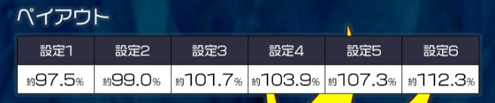 | スペック | 機械割(ペイアウト):設定1_約97.5%/設定2_約99.0%/設定3_約101.7%/設定4_約103.9%/設定5_約107.3%/設定6_112.3% |