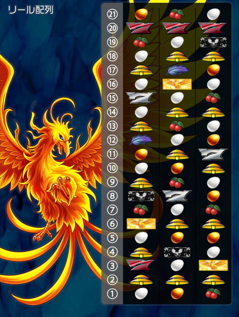 | 基本情報詳細 | BIGボーナス、REGボーナス、PHOENIX BIGボーナス、PHOENIX REGボーナスを搭載した実機風スロット。 ボーナス初当たり→ボーナス後のPHOENIX TIME突入(リプレイタイム)→ボーナス再当選→再度PHOENIX TIME突入!のループで大量獲得を目指せ!ボーナス消化中に白タマゴ成立でプレミア役当選の大チャンスが到来だ!通常時の白タマゴ連続成立、チェリー成立、金のタマゴ成立はボーナス当選に期待しよう。 実践中はボーナス確率や各種小役出現率のデータをとっておくと、設定判別に役立つぞ! |