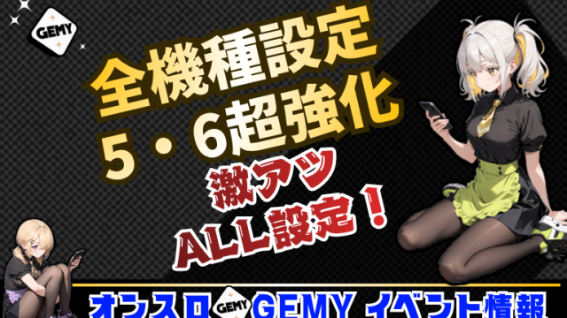 GEMY(イベント情報) 本日から全機種設定5・6超強化のALL設定! 全機種が設定5・6の超強化!ランキング上位入賞でプレミアム応募券もGET可能。チャンス降臨券やゴールドプラン特典を活かして、レベルアップ&景品獲得を狙おう! 2025.11.03 GEMY(イベント情報)GEMY(ゲミー)